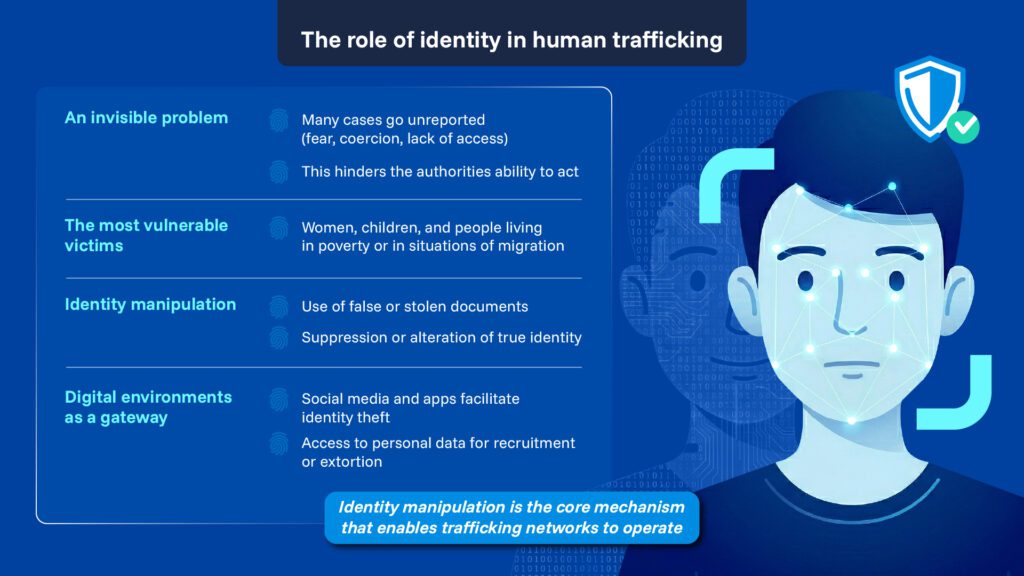 This is why one of the fundamental pillars sustaining human trafficking is the manipulation of identity. From the first contact to the exploitation phase, criminals systematically resort to the falsification, alteration, or suppression of victims’ identities, as the use of forged documents or documents belonging to third parties allows criminal networks to move victims between cities and even countries, making them difficult to track. Considering this, social networks, dating applications, and other digital environments have become one of the main sources of information for traffickers, as the lack of robust and reliable identity verification processes facilitates impersonation and access to personal data that are later used for recruitment and blackmail.