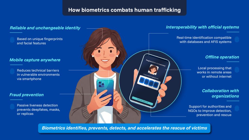 Biometric solutions are based on the capture of unique and immutable physical characteristics (such as fingerprints or facial features) to reliably identify a person. Unlike traditional documents, these credentials cannot be lent, stolen, or easily falsified, positioning biometric authentication solutions as a widely adopted global security standard, with a direct impact on the prevention and detection of crimes such as human trafficking. Thus, the generation of biometric digital credentials provides a reliable identity backup in cases of disappearance or suspected trafficking, as they can be matched within seconds by law enforcement authorities at border controls, airports, banking institutions, or reception centers.