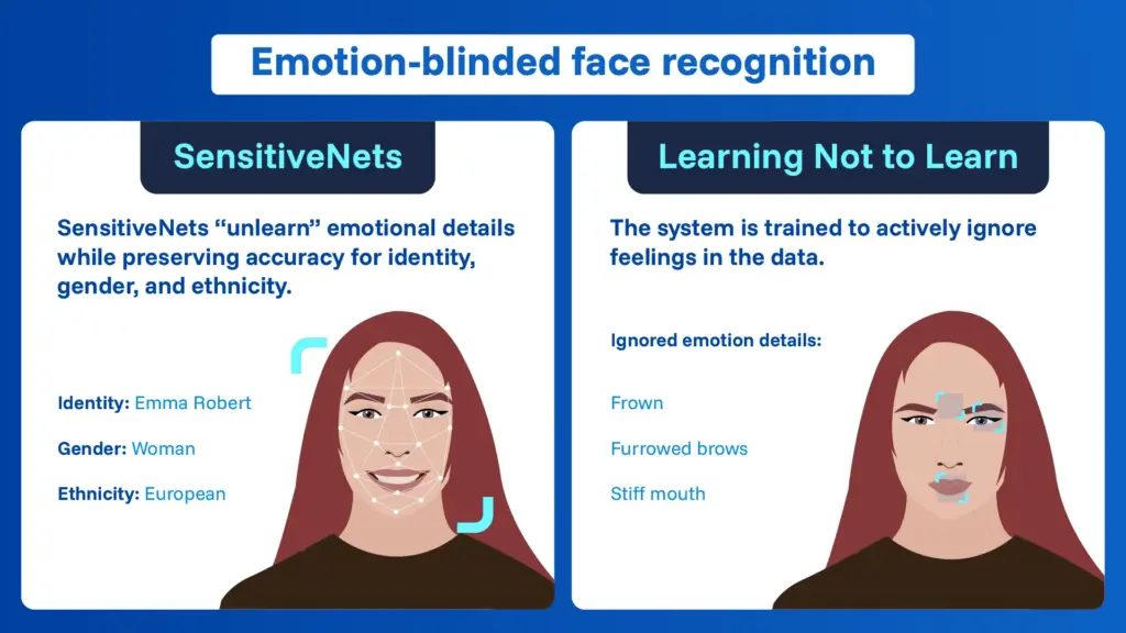 - SensitiveNets: Imagine teaching a student to focus only on names in a class photo and ignore everything else.SensitiveNets “unlearn” emotional details while preserving accuracy for identity, gender, and ethnicity.